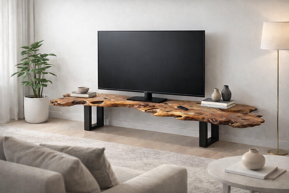 It is a TV stand crafted from a single board of solid reclaimed olive wood, selected for its natural and unrepeatable grain.